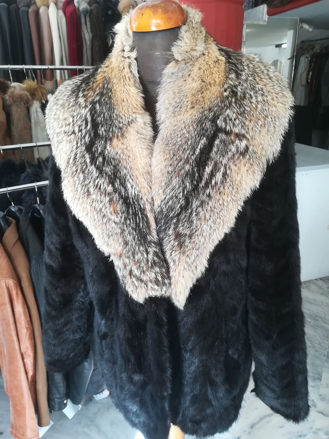 Ενα εντυπωσιακό κομμάτι πού δέν θά περάσει απαρατήρητο σέ χρώμα καφέ μέ γιακά απο φυσικό χρώμα αλεπούς καναδέζικης πολύ μαλακό ,το μέγεθος είναι ανάμεσα στό M καί τό L , τό μάκρος τού μετρημένο από τήν πλάτη είναι 64 πόντους μέ πολύ καλή κατεργασία εξαιρετικής ποιότητος Οποιαδήποτε επιδιόρθωση χρειαστεί,την αναλαμβάνουμε εμείς με στην βιοτεχνία μας χωρίς επιπλέον κόστος. Οι τιμές μας είναι πολυ χαμηλές,γιατί είμαστε οι ίδιοι κασκευαστές και δεν τα εμπορευόμαστε,ως μεσάζοντες.