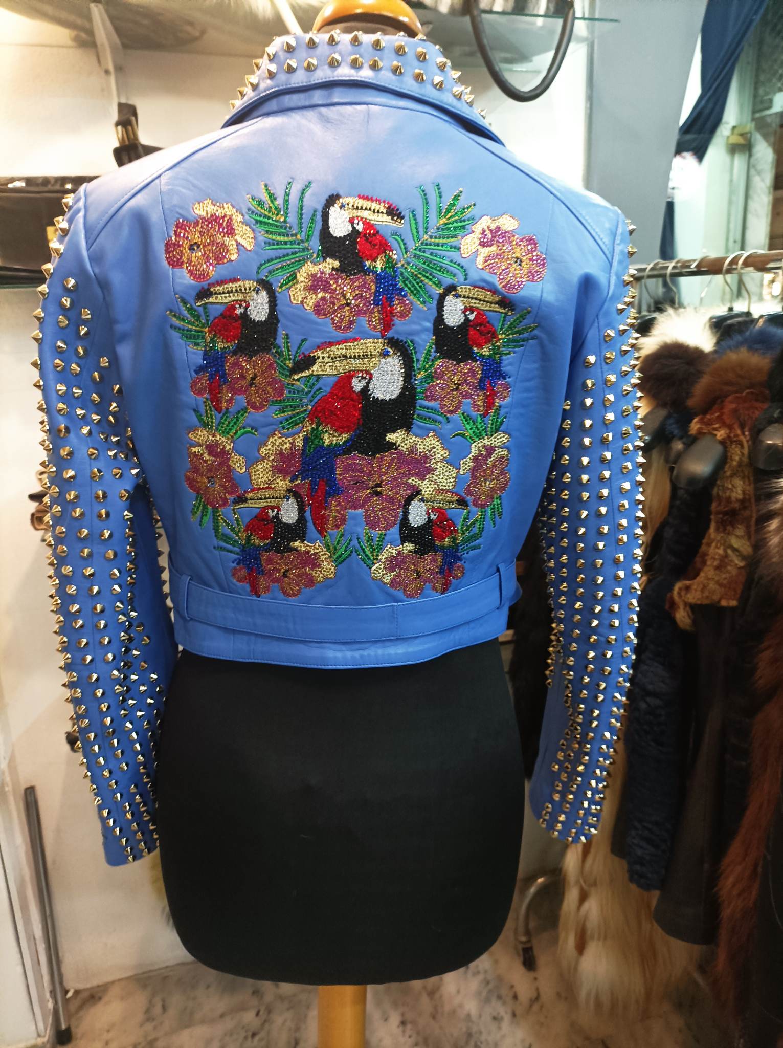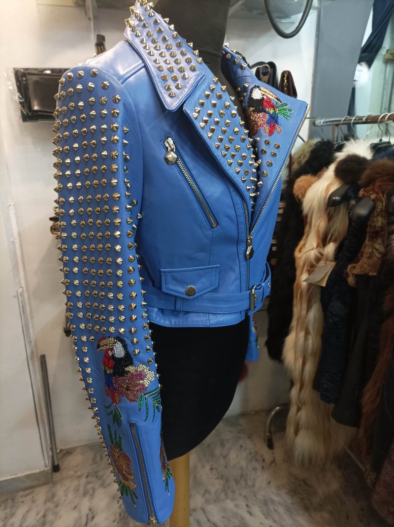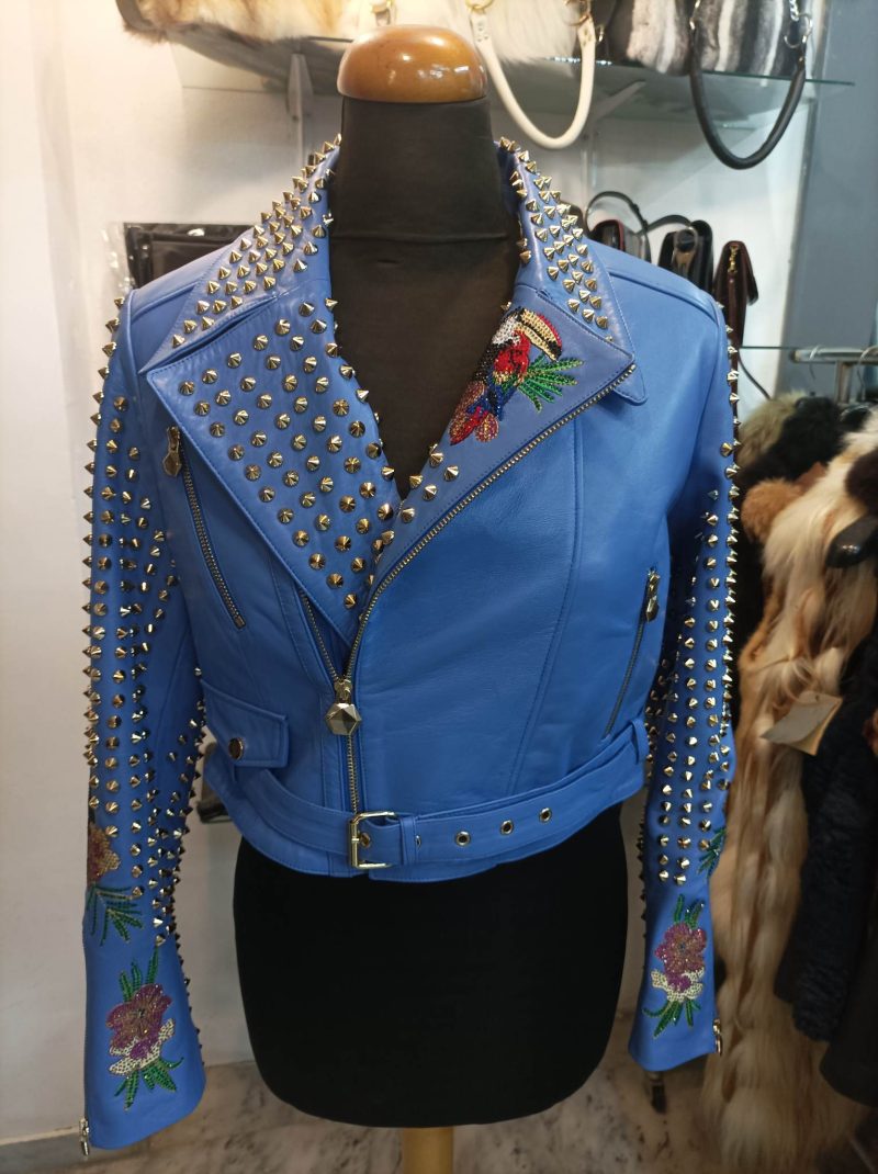 Μπουφάν δερμάτινο, σε πολύ μοντέρνα γραμμη τύπου bike jacket, κουμπώνει με φερμουάρ στο πλάι ,με γιακά πέτο που όταν κουμπώνετε το φερμουάρ, γινετε μπεμπέ, ειναι φτιαγμενο με κεντηματα και με κρουπακια καρφια ολα βαλμενα στο χερι τα νούμερα που υπάρχουν είναι το S και το L Οποιαδήποτε επιδιόρθωση χρειαστεί την αναλαμβάνουμε εμείς με την βιοτεχνία μας χωρίς επιπλέον κόστος. Οι τιμές μας είναι πολυ χαμηλές γιατί είμαστε οι ίδιοι κασκευαστές και δεν τα εμπορευόμαστε ως μεσάζοντες.